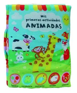 Libros de tela ilustrado con actividades relacionadas con los centros de interés de los bebés a partir de 1 año: números, colores, tamaños, contrarios, etc. El libro contiene sonajeros, solapas, un muñeco cosido, etc.